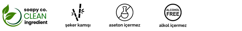 Aseton, Alkol, Ethyl Acetate, Butyl Acetate ve Ethyl Lactate gibi cildinize ve doğaya zarar veren maddeleri içermez. Petrol ve petrol türevleri, paraben, silikon içermez. Cildi nemlendirici etki gösterir. Cam ambalajı sayesinde geriye plastik atık bırakmaz. Tüm Soapy Co. ürünleri vegan içeriğe sahiptir ve hayvanlar üzerinde test edilmemiştir. Soapy Co. vegan ve cruelty-free ürünlerini PETA Sertifikası ile güvence altına almaktadır.